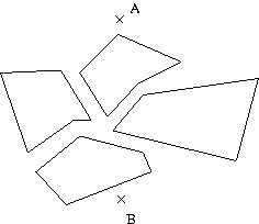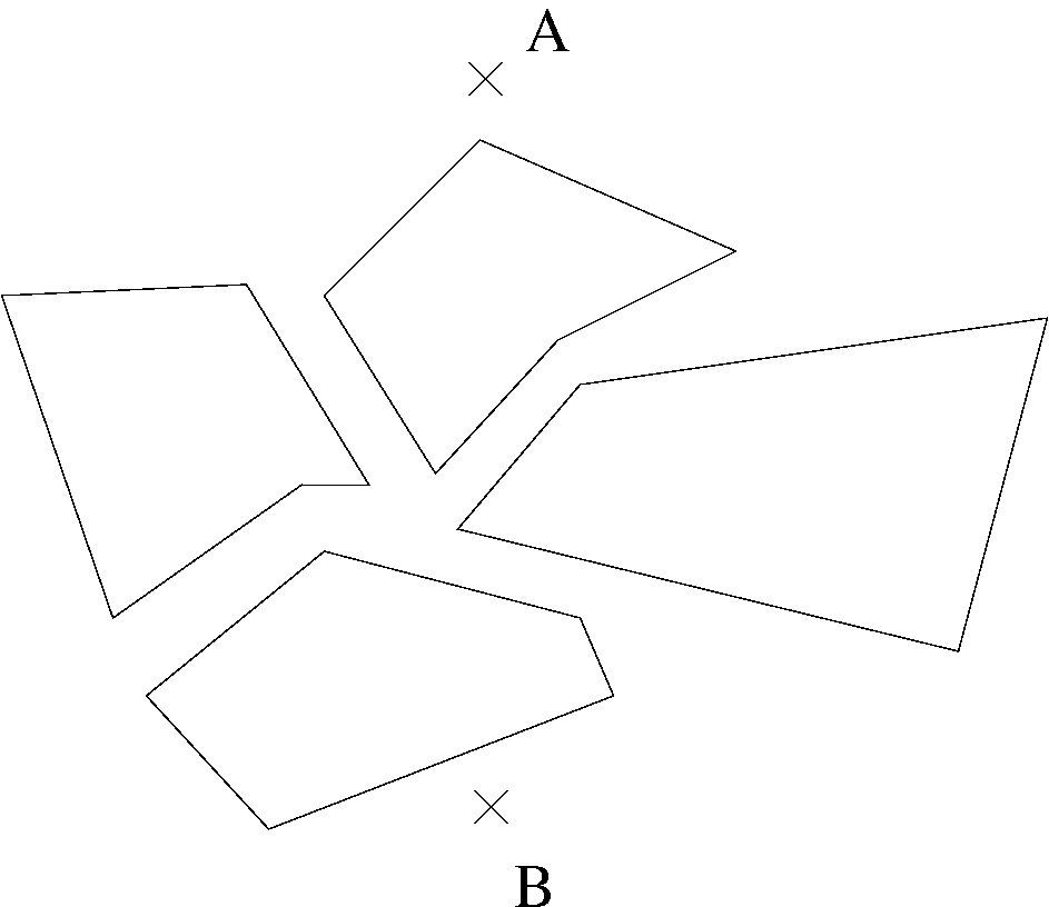 Als KĂŒrzeste-Wege-Problem dient uns ein Szenario, das einer Landkarte Ă€hnelt. Wir haben einen Startpunkt und einen Zielpunkt. Weiterhin gibt es Hindernisse, die wir nicht ĂŒberwinden können. Um ein solches Szenario zu speichern,benötigen wir eine Art Szenariodatei. In dieser Datei stehen alle nötigen Informationen, d.h. die Koordinaten der Start- und Zielpunkte und die Lage der Hindernisse, die bei uns durch geschlossene Polygone reprĂ€sentiert werden. (Ein geschlossenes Polygon ist eine Menge von Punkten bei denen jeder mit dem nĂ€chsten und der letzte mit dem ersten Punkt verbunden sind. Unsere Polygone haben keine SelbstĂŒberschneidungen.) Um das Problem noch ein wenig komplexer zu machen, fĂŒhren wir noch sogenannte Beamspots ein, an denen man sich zu einem anderen Spot beamen lassen kann. Beamspots treten immer gruppenweise auf (d.h. mindestens zwei), und innerhalb einer Gruppe kann man von jedem Spot zu jedem anderen reisen. Das folgende Beispiel zeigt eine solche Datei und das zugehörige Szenario.