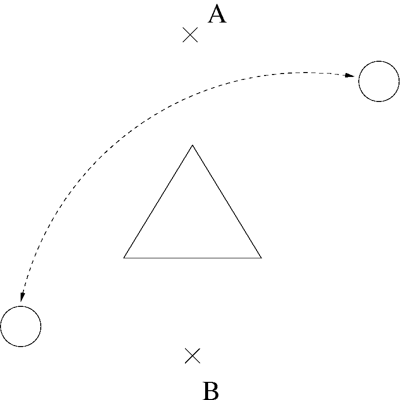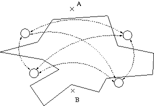 - Nachdem wir es geschafft haben den kĂŒrzesten Weg in sehr komplexen Szenarien zu bestimmen, wollen wir versuchen unsere Fragestellungen ein wenig zu verallgemeinern und fragen nun nach dem Weg vom Start- zum Zielpunkt mit minimaler Winkelsumme. Diese ergibt sich durch Aufaddieren aller beim Ăbergang von einer Kante zu einer anderen auftretenden Winkel, die sich durch die RichtungsĂ€nderung ergeben. Als Beispiel betrachte man folgende Abbildung rechts in denen zwei Wege (einmal als durchgezogene und einmal als gestrichelte Linie) eingezeichnet sind.