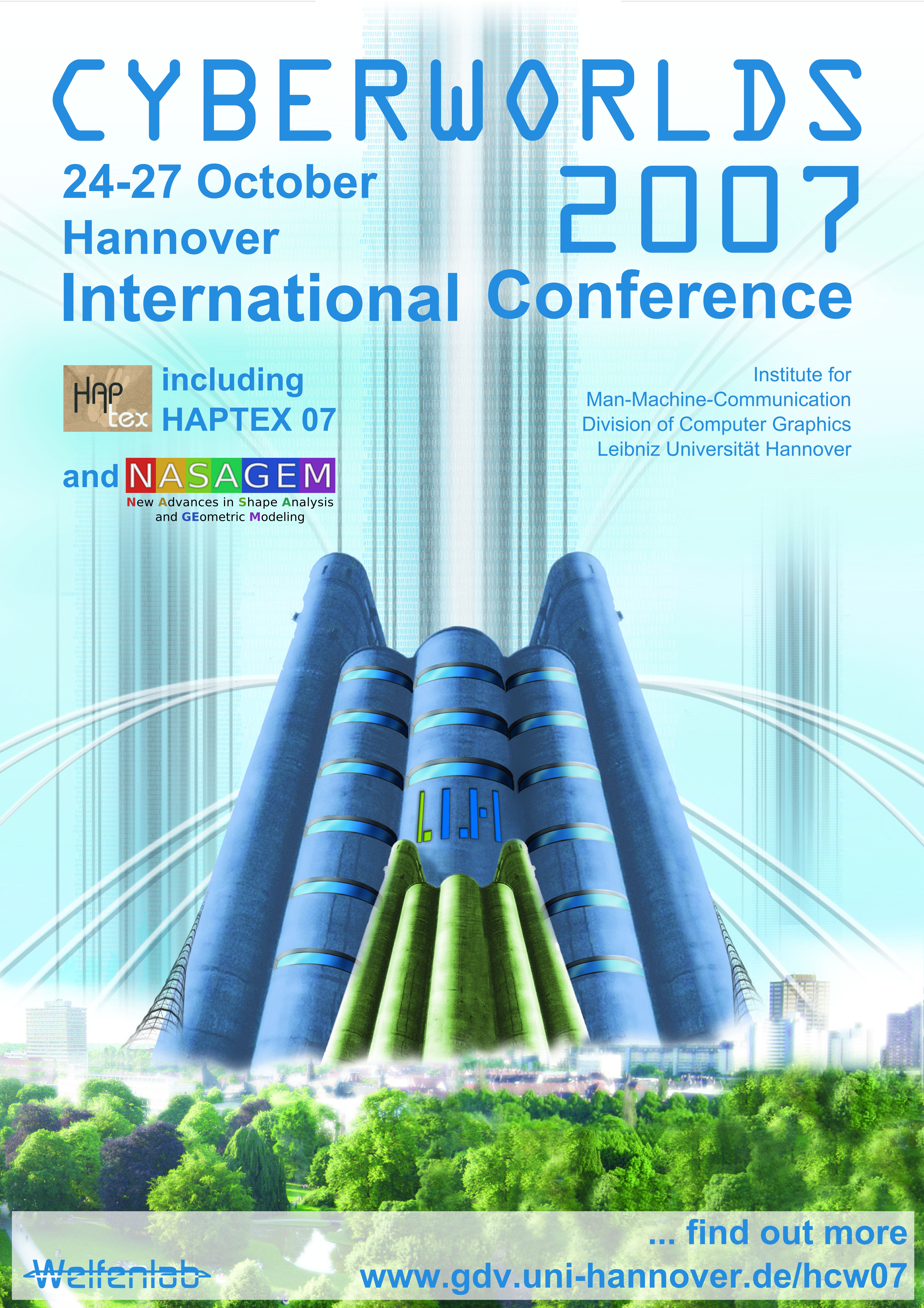 Here you can find all media that you need if you want to help us advertise the Cyberworlds 2007 Conference (or one of the workshops), like the official link logos, the conference poster or the different calls for papers.