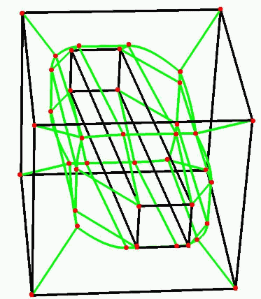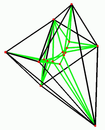| Shows with green color the boundary curves of the medial axis of a disc like solid D whose boundary is defined here by triangular facets the edges of which are the black line segments describing the solids boundary surface by a wireframe model. The medial axis of D is given here by a collection of two-dimensional surface sheets whose boundary edges are green. Those edges have red vertices. | With the same usage of colors as in the figure on the left, we display the Medial Axis of Solid T. The boundary surface of T (indicated by the black wireframe model) is topologically a torus surface. |