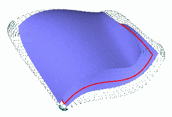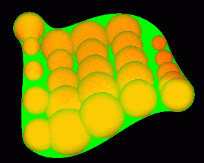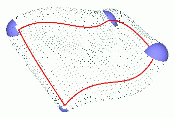 | Shows yellow-orange colored spheres of maximal size that are contained in B. Those spheres typically (but not always) touch the boundary surface of B. The set containing all centers of those spheres of maximal size defines the Medial Axis of the solid B. This medial axis in this example is (a rectangular surface patch). | The shape of the medial axis of the solid B is indicated by the red colored boundary curve of the surface patch being the medial axis of B. | Displays in blue color the boundary surface parts of the solid B. Those boundary surfaces can be understood to constructed as envelope surfaces of the family of maximal sphere shown in the first picture of this sequence. |