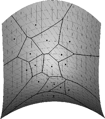 | Shows the Geodesic Voronoi Diagram with respect to the finite point set P (given by the black dots) on the wave-like shaped surface S. This geodesic Voronoi diagram is given by the black edges. Each of those edges consists of points that are (geodesically) equidistant with respect to two (specific) points of the discrete set S. Here the geodesic distance between two given surface points is defined by the minimal length of all surface curves joining the two given points. As in the Euclidean case the geodesic Voronoi diagram partitions the surface into separate open domains. Each of those open domains contains exactly one point p of P. Together with p, the respective open domain contains all surface points whose geodesic distance to p is smaller than to any other point in the set P. | With the same conventions as in the previous wave like surface (figure on the left) we display now the geodesic Voronoi diagram of a finite point set located on a hyperbolic paraboloid surface |
