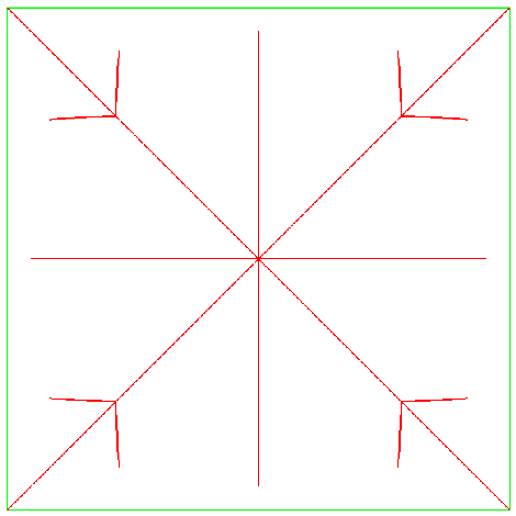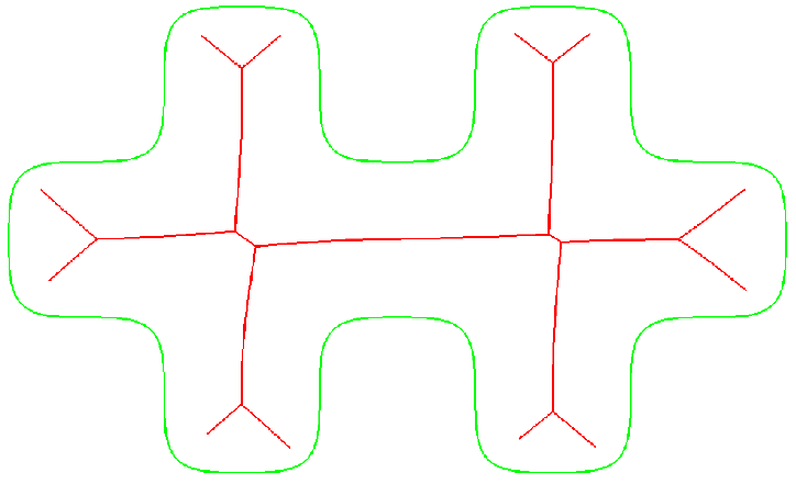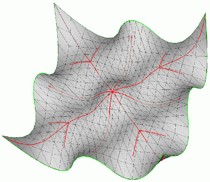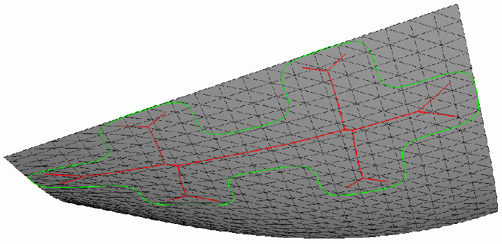 | Geodesic Medial Axis (in red ) for a surface patch (boundaries in green ) contained within a larger curved surface (a rational B-spline here). | Back-projection in a rectangular parameterization domain containing the initial (sub)surface boundaries (in green ) and the computed geodesic medial axis (in red ). |