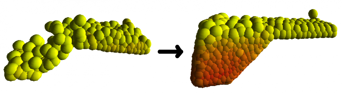 Da die Anwendungen der Fluidmechanik komplex genug sind, um ein eigenes Labor oder eine Vorlesung zu füllen, stellen wir exemplarisch einen partikelbasierten Ansatz vor, die sogenannten smoothed particle hydrodynamics, in der die physikalischen Eigenschaften des simulierten Mediums an einem Punkt aus den Werten benachbarter Partikel abgeleitet werden. So wird der Einfluss einzelner Partikel auf Größen wie Druck und Flußgeschwindigkeit durch einen sogenannten Kernel dargestellt. Eine zusätzliche Herausforderung sind die, im Gegensatz zum Textil, hochgradig veränderlichen Nachbarschaftsbeziehungen zwischen den Partikeln, die in jedem Simulationsschritt neu berechnet werden müssen.
