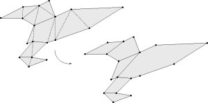 Die Idee liegt also nahe, nach großen planaren oder quasiplanaren Teilgebieten bestehend aus mehreren Dreiecken zu suchen, um diese dann als Vereinigung einer Menge von konvexen Polygonen darzustellen. Es wird also ein Algorithmus benötigt, der ein in triangulierter Form vorliegendes Gebiet (Polygone) in möglichst wenige konvexe Teilstücke zerlegt.