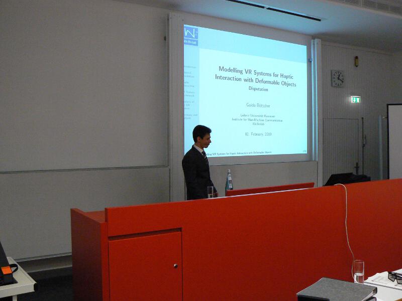 Anläßlich der Disputationen von Karl-Ingo Friese und Guido Böttcher fand am 2. Februar 2010 ein kleines Symposium statt. Die Themen der Disputationen sind 3D-Visualisierung und -Segmentierung in der Medizin bzw. die haptische Interaktion mit deformierbaren Objekten. Erst- und Zweitprüfer waren jeweils Herr Prof. Franz-Erich Wolter und Frau Prof. Nadia-Magnenat Thalmann von der Universität Genf.
