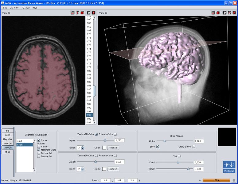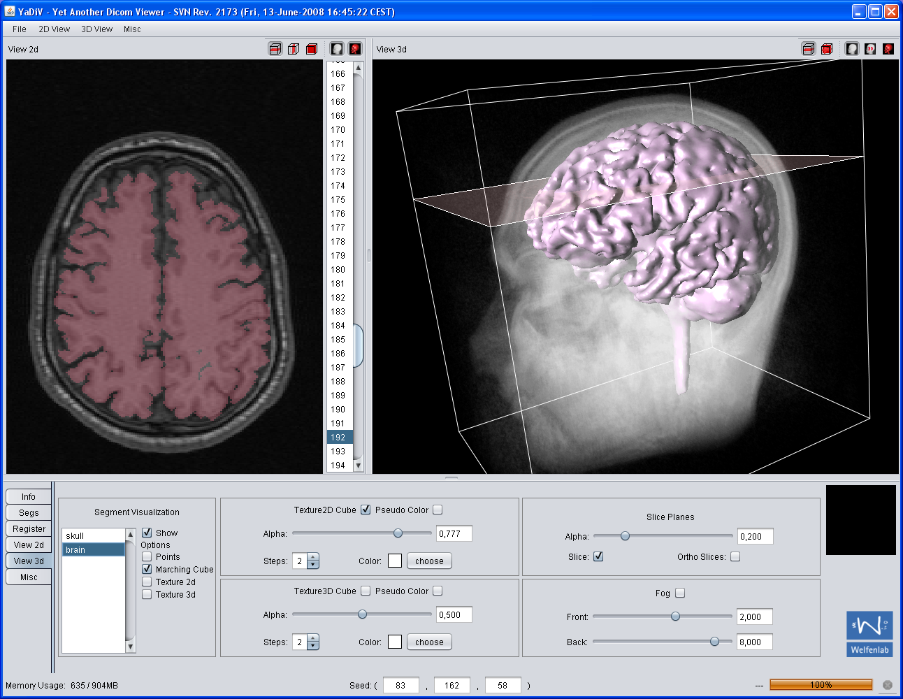 Für die 3D-Visualisierung wird Java3D (Version 1.6.0) eingesetzt. Alle zeitkritischen Verfahren wie eine Level-Set Segmentierung oder das Einlesen großer Daten wurden als eigener Thread implementiert, so dass die Programmoberfläche niemals blockiert wird. So wird z.B. nach einer Änderung eines Segmentes im Hintergrund ein automatisch verfeinernder Algorithmus für die 3D Darstellung gestartet, damit Änderungen sofort sichtbar werden. Wenn sich das Segment erneut ändert bevor die höchste Verfeinerungsstufe erreicht wurde, startet der Verfeinerungsalgorithmus automatisch neu.